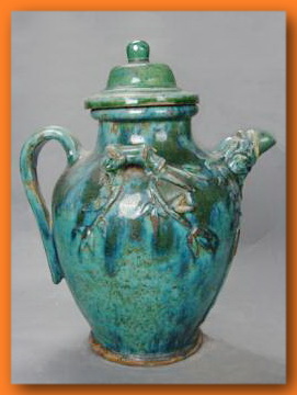 在追溯石灣藝術陶瓷的源流時,我們很多時會想到河宕遺址的印紋陶或者瀾石的古墓葬出土的陪葬物,但這不應該成為石灣藝術陶的真正源流。正如陶器的出現,世界各地是不需要互相學習而自發產生的。印紋陶和漢墓葬在全國范圍內許多地方都有出現,在石灣及周邊地區出土的陶器并未顯露出后來石灣窯藝術陶瓷的明顯特征,只可以說明石灣地區開始有人做陶,隱含了制陶的基因。石灣藝術陶瓷真正起源于明代,這是得到眾多文化學者的認同。在藝術陶的五大種類中,較早出現的是藝術器皿。明代蘇可松的《翠毛釉貫耳瓶》是現今保存較好的有作者姓名,年代確切的作品。根據記載,明代陳粵彩、楊升、揚名都是擅于制作器皿的名家,雖然沒有見到過他們作品的存世品,但他們的名字能流傳下來,作品也不是一般的日用器。“陳粵彩經常使用醬黃釉、綠釉等制作器物,作品較為細致整齊”,“楊名傳世器多仿古銅器,精制黑釉,常用黑白兩種釉色,簡潔樸素”,“楊升作品多仿漢代銅器式樣,擅長粉藍色釉”。這些明代的陶藝名家做的已不是一般的日用陶器,在造形和施釉方面都有一定追求的工藝美術品,作品因廣受歡迎和珍惜才會使作者留名后世。從清代大量生產的日用器皿,有不少看到藝術陶器的影子。如白釉行(古石灣陶業行會之一)的飯豉(罐),用于從廚房的大鐵鍋里盛飯到飯廳的容器,上面有浮雕龍、雞等圖案裝飾,還覆蓋了漂亮的黃釉或綠釉;花盆行(古石灣陶業行會之一)的藥酒壺(高約80~90厘米),以龍頭作壺嘴,梅花或竹裝飾壺耳;掛在墻上的掛壁,裝飾以動植物的造型,中空又可盛水養植物。總之,石灣生產的陶瓷制品中既實用又美觀的比比皆是。石灣日用陶瓷的生產始于唐宋,到明清達到鼎盛。隨著銷售的暢旺、見識的增加,將日用陶器做得更精美,提高其附加值,這是石灣制陶者和商家很易會想到的,日用陶器的造型也從簡單到復雜,釉色從單調到豐富,從而促使石灣藝術器皿的產生和成熟。
